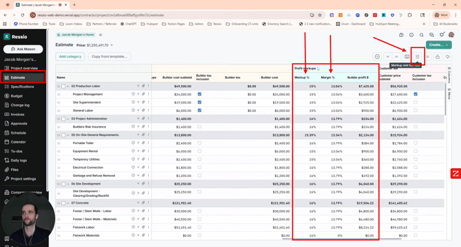 Markup is typically what builders set and apply in Ressio before locking the estimate: