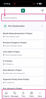 After launching, you'll arrive at the main Projects page where you can see all active projects. Navigation occurs through tabs at the bottom and a top navigation bar within specific projects.