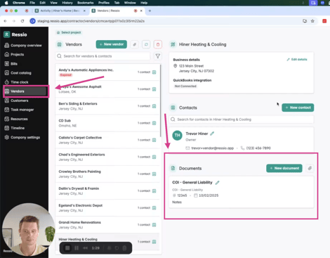Ressio now gives you the ability to add, customize, and manage multiple documents for each vendor profile. This update provides flexibility for tracking certificates of insurance, compliance records, contracts, and other essential documents tied directly to your vendors.